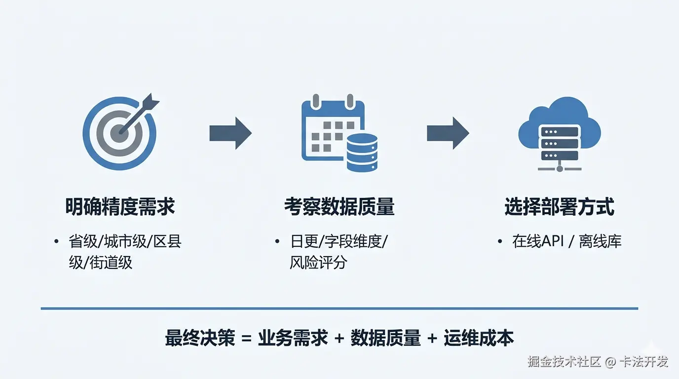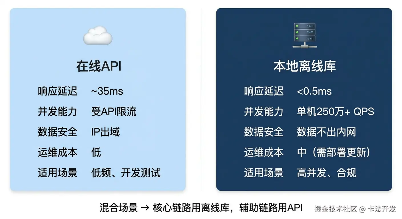 - 混合场景 → 核心链路用离线库,辅助链路用API