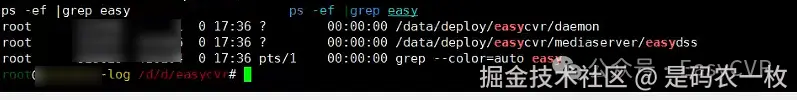 这是一条最基础的Linux命令,用来查看系统里所有名字里带“easy”的进程。EasyCVR的可执行文件名字里就包含这个词,用这条命令能一眼看出它到底跑没跑起来。