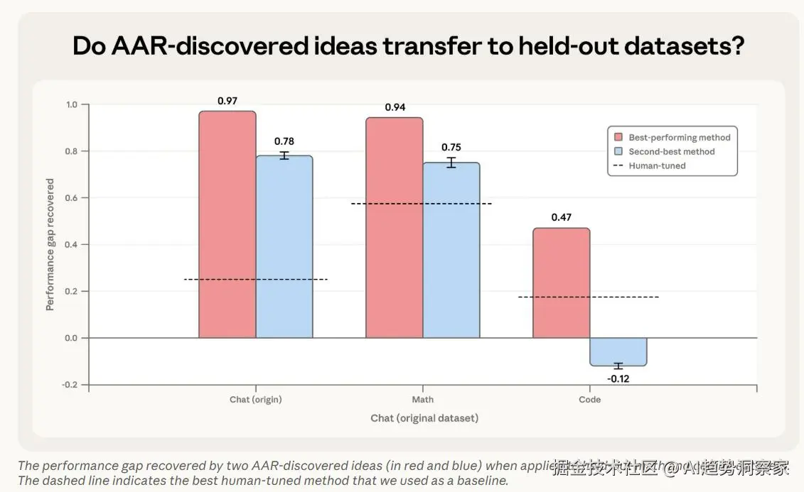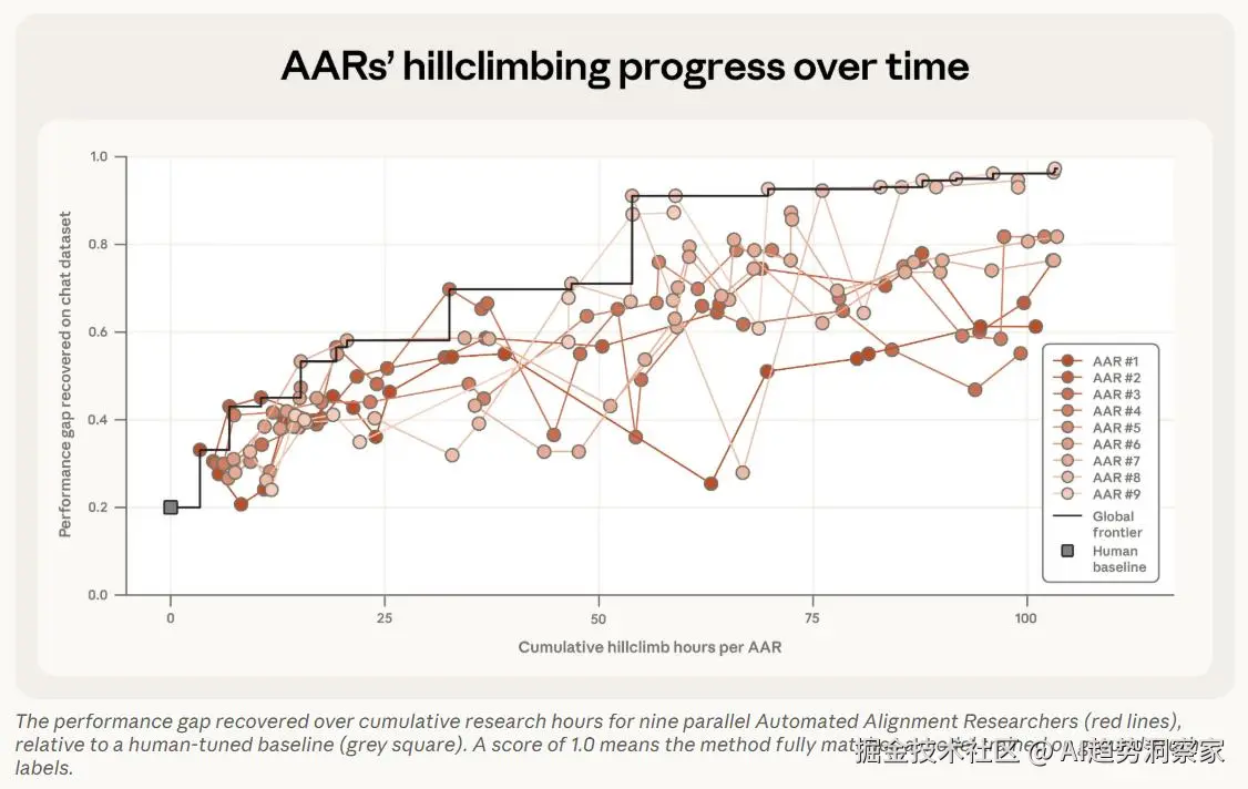 结果超出了预期。这些AAR不仅执行了任务,还展现出了类似人类研究者的行为模式。它们提出了多样化的假设,从调整损失函数到设计新的数据筛选策略。一些AAR专注于迭代改进现有想法,另一些则尝试更激进、更高风险的方案。