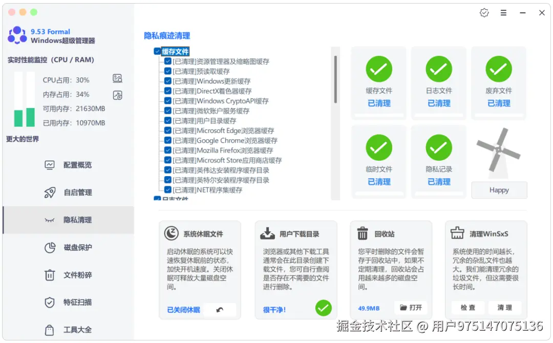 在隐私清理中可以一键快速的扫描缓存文件、日志文件、废弃文件、临时文件以及隐私记录,并直接将它们从电脑中清理掉,同时还可以直接一键关闭系统休眠、清理下载目录等。