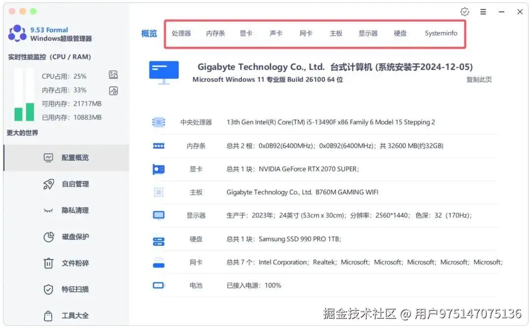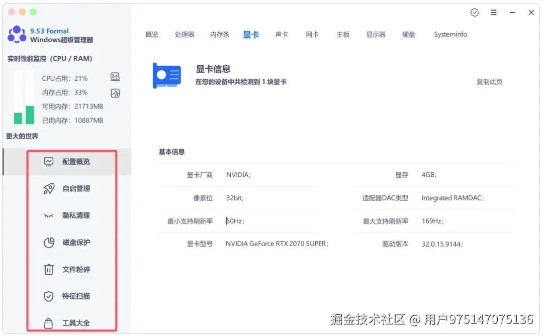在配置概览中可以直观清楚的查看到包括CPU、内存、显卡、声卡、网卡、主板、显示器等在内的电脑所有硬件的参数。