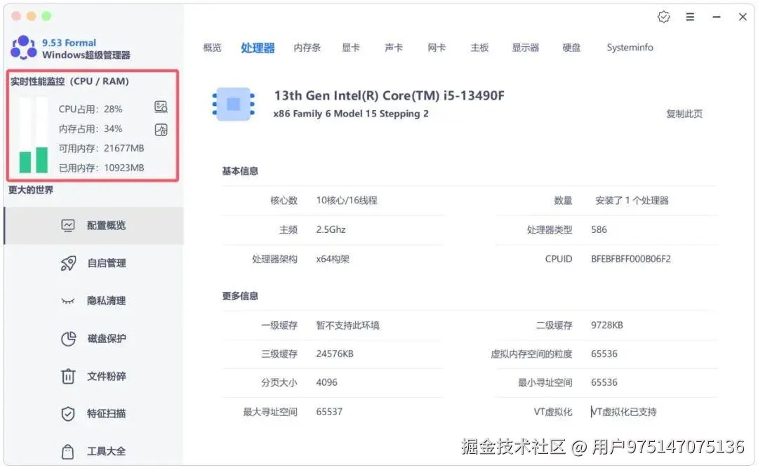 软件的界面非常简洁清爽,在左侧可以看到CPU和内存的实时性能监控。