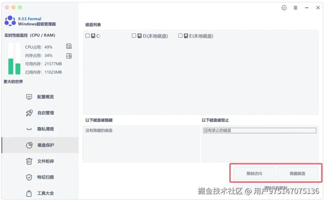 在磁盘保护中可以隐藏我们的磁盘分区,或者是限制其他人访问我们的磁盘分区,以此来保护我们的隐私。