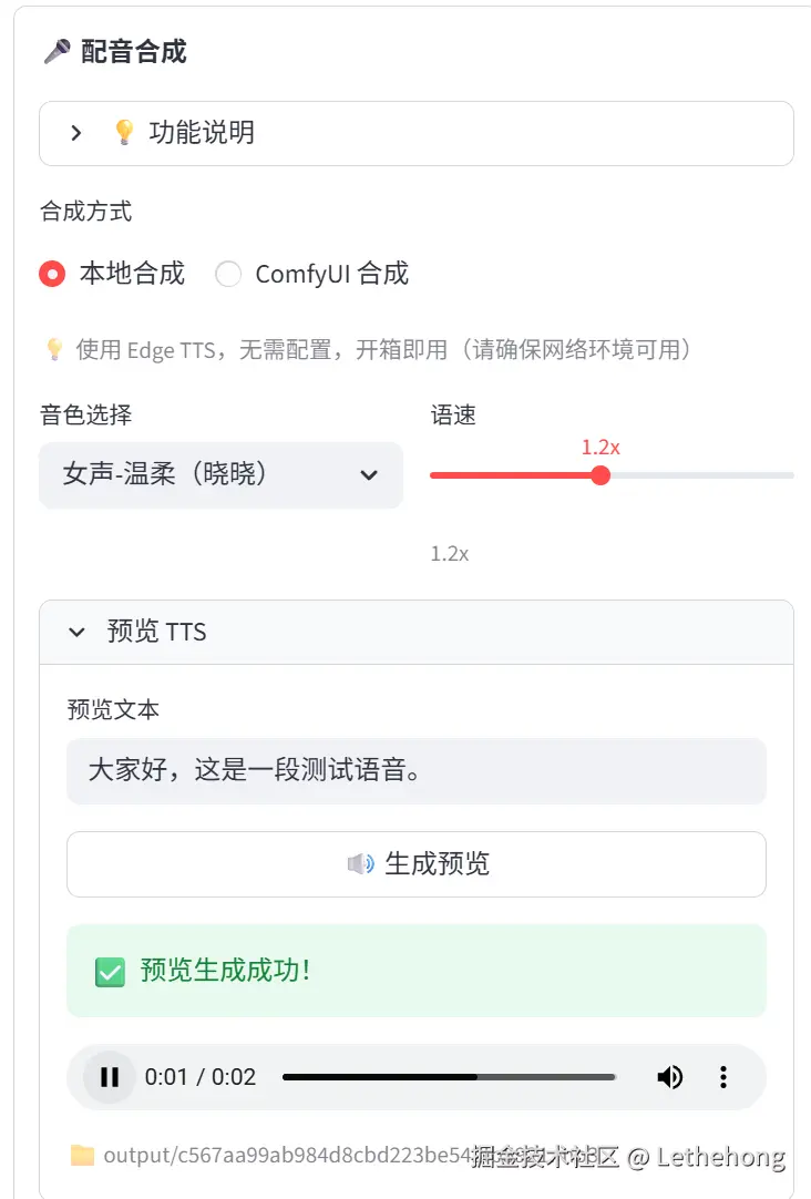 - **声音的形状:**选择 TTS 工作流(如 Edge-TTS)。若需定制音色,上传一段几秒钟的参考音频,点击「预览语音」试听,确保叙述者的灵魂附体。
