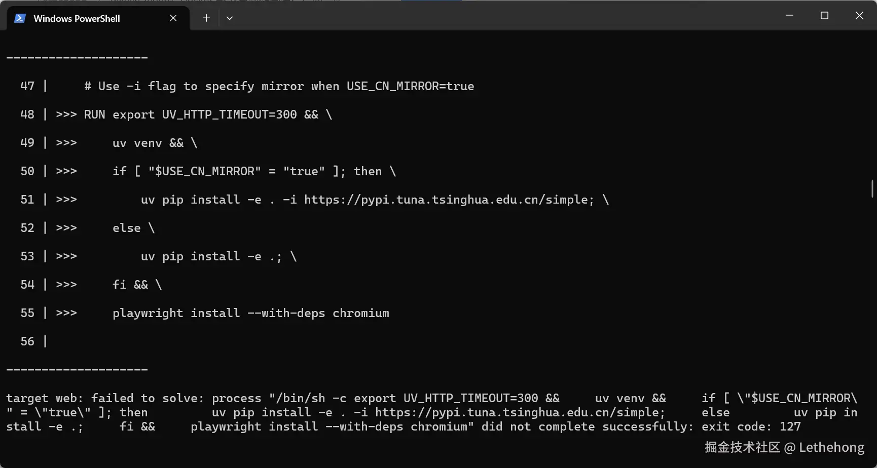 解决之道在于“化整为零”: 用任意编辑器打开项目根目录下的 Dockerfile,找到那段包含 playwright install --with-deps chromium 的代码块,将其临时删去,只保留 Python 依赖的安装:
