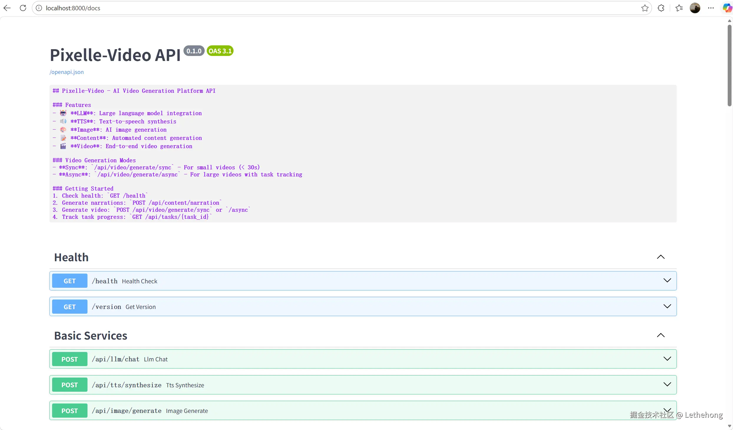 当你不再满足于点击界面,渴望将 Pixelle-Video 嵌入到自己的内容生产流水线中时,API 便是对你敞开的后门。 访问 http://localhost:8000/docs 这里有基于 Swagger UI 生成的详尽接口说明书。按照其中的参数格式,发送一个简单的 POST 请求,你就可以在另一台服务器、一个定时脚本、甚至是一篇博客的发布钩子中,悄无声息地批量生成视频。