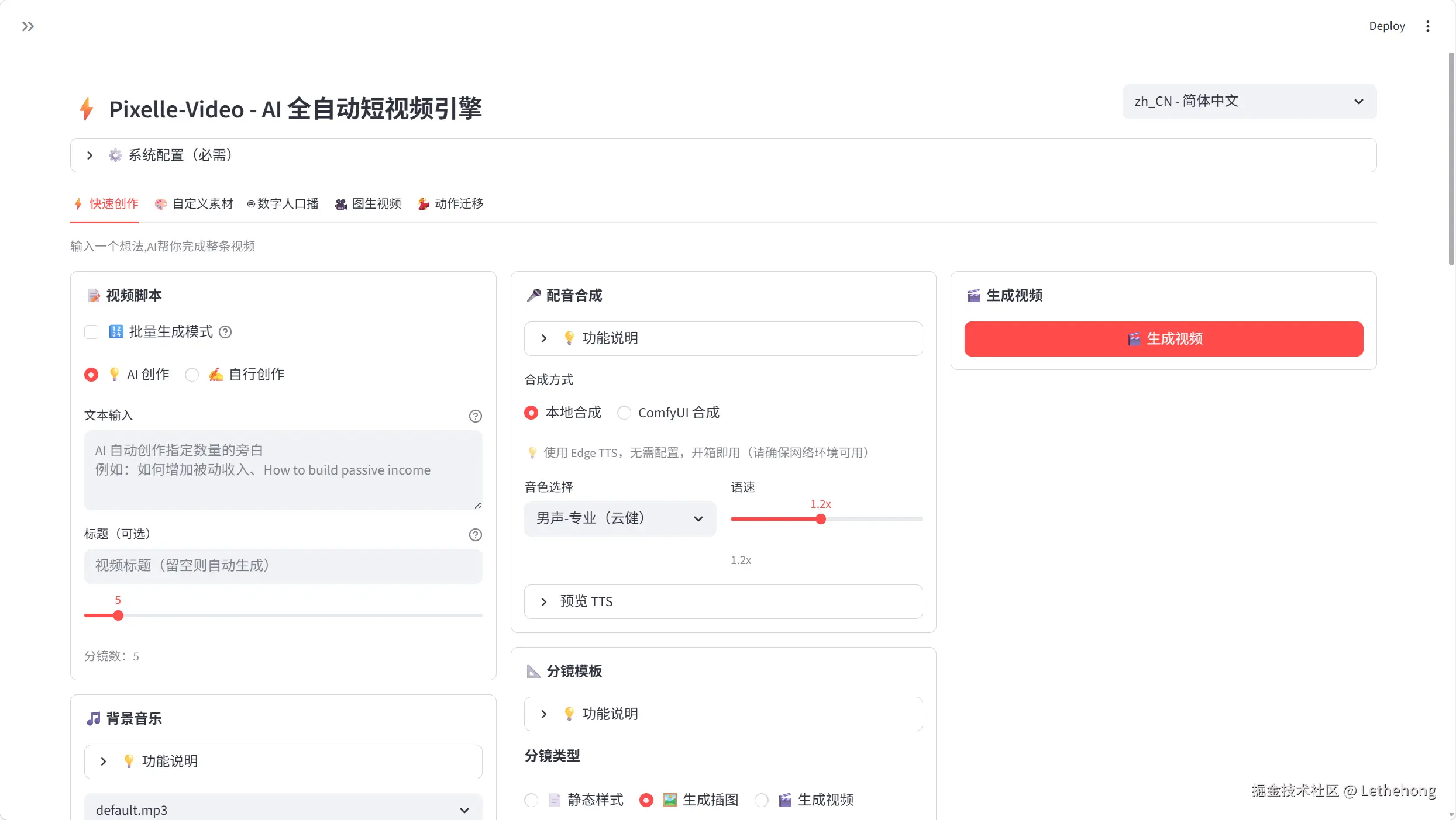 Pixelle-Video 本质上是一个调度中心,它自身并不生产算力,而是优雅地指挥外部的 AI 模型为你效劳。因此,首次进入 Web 界面,展开左侧的「⚙️ 系统配置」是必做的功课。