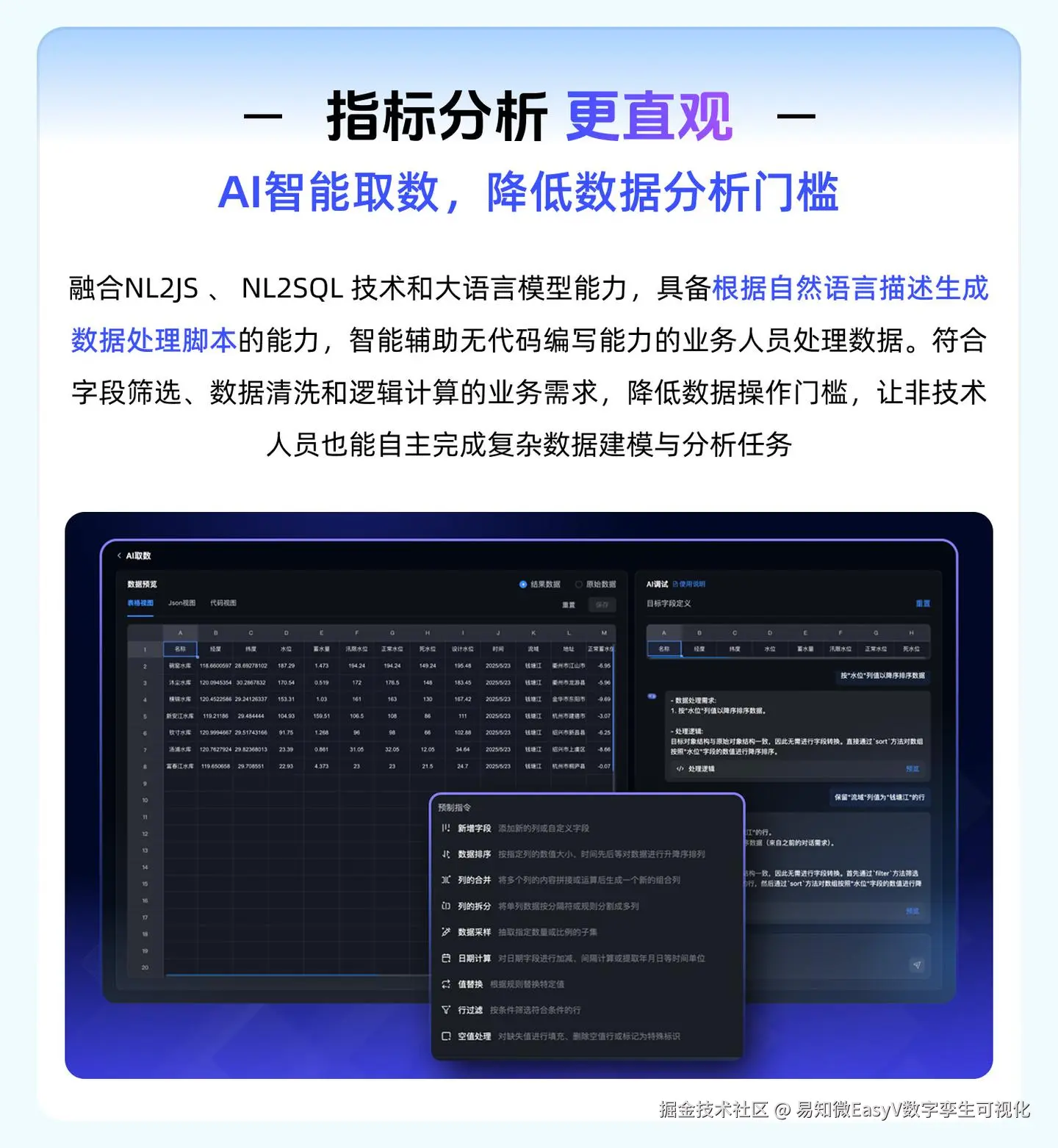 针对非标准数据源的接入难题,EasyCode智能编程功能可理解业务人员的算法指令,自动生成JavaScript代码,完成数据格式转换与逻辑运算。这不仅减少了人工编写代码的错误率,更将数据接入效率提升50%以上,让企业能快速整合各类异构数据,构建统一的数据底座。