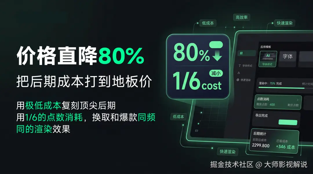 AI 解说大师的视频渲染模板这次做了一轮模型层面的升级,渲染价格直降 80%,单条视频的点数消耗只有原来的 1/6。