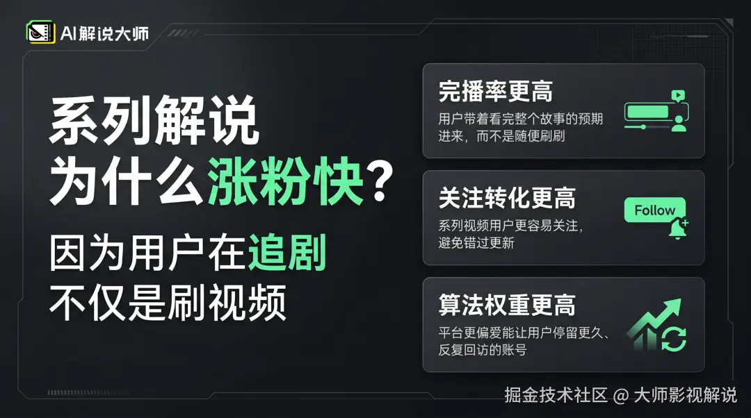 单条解说视频的爆款,本质上依赖标题、封面、黄金3秒钩子这些重要因素,但用户看完就划走,账号沉淀不下来。