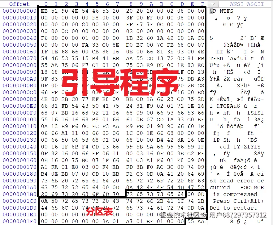 扇区最后的两个字节“55AA”(偏移1FEH~偏移1FFH)是MBR的结束标志。
