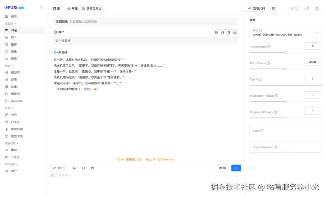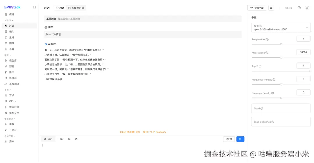 部署完成后,可在试验场进行模型对话测试,验证模型推理是否正常。