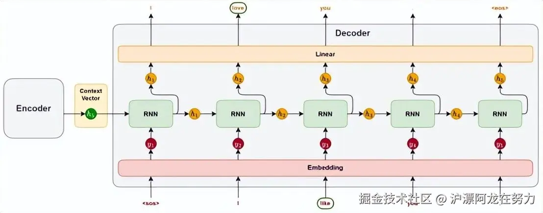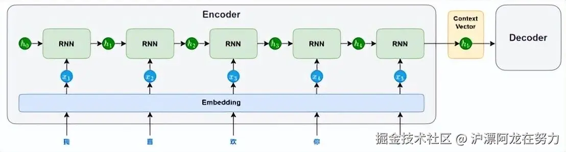编码器的任务:逐个处理输入序列中的元素,并将整个序列的信息压缩成一个固定长度的上下文向量(Context Vector,也叫语义向量或“思想向量”)。