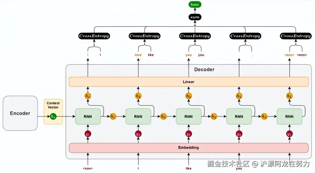 这种训练方式被称为“教师强制”,因为每一步都有一个“教师”(真实目标词)强制告诉模型“下一步应该输入什么”,将模型拉回正确的轨道上。