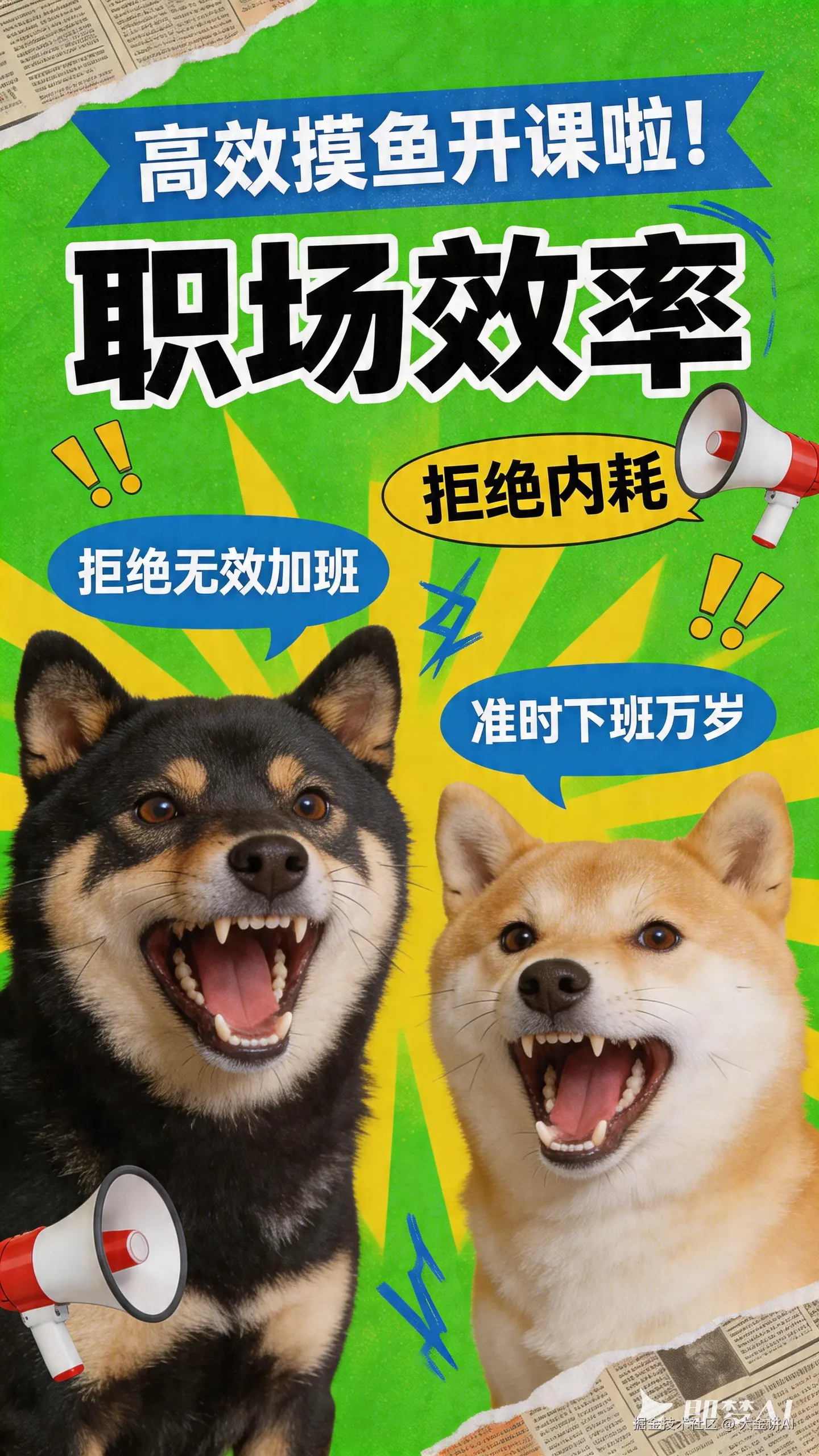 竖版 9:16 小红书封面,职场效率主题海报,黄绿撞色放射状背景,美式复古拼贴风,中心是两只张大嘴狂叫的黑柴和黄柴,表情夸张激动,顶部蓝色箭头横幅写「高效摸鱼开课啦!」,中间超大号黑字白边「职场效率」,右侧黄色椭圆标签写「打工人必备」,蓝色对话气泡写「拒绝无效加班」「准时下班万岁」,点缀红白喇叭、旧报纸撕边,网感拉满,高清 8K,细节清晰,无变形