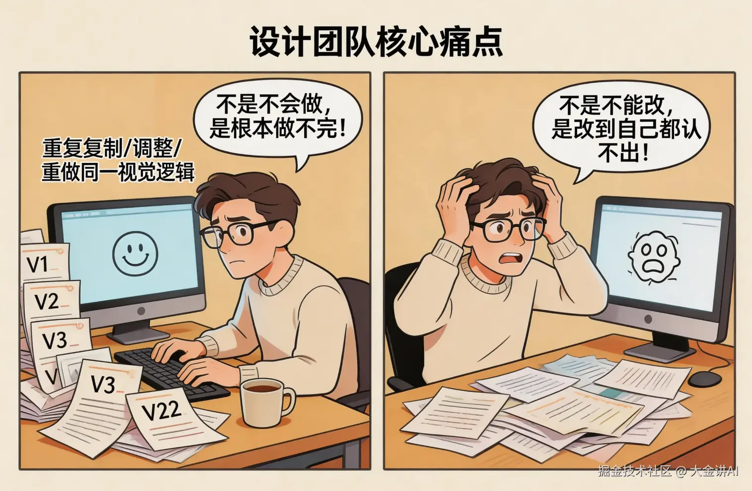 问题就出在这里。设计团队每天消耗最多时间的,不是设计本身,而是不断把同一套视觉逻辑复制、调整、扩展、重做。以前这件事只能靠人硬扛,所以设计师最常见的工作状态就是:图不是不会做,是根本做不完;稿不是不能改,是改到最后自己都快认不出来了。