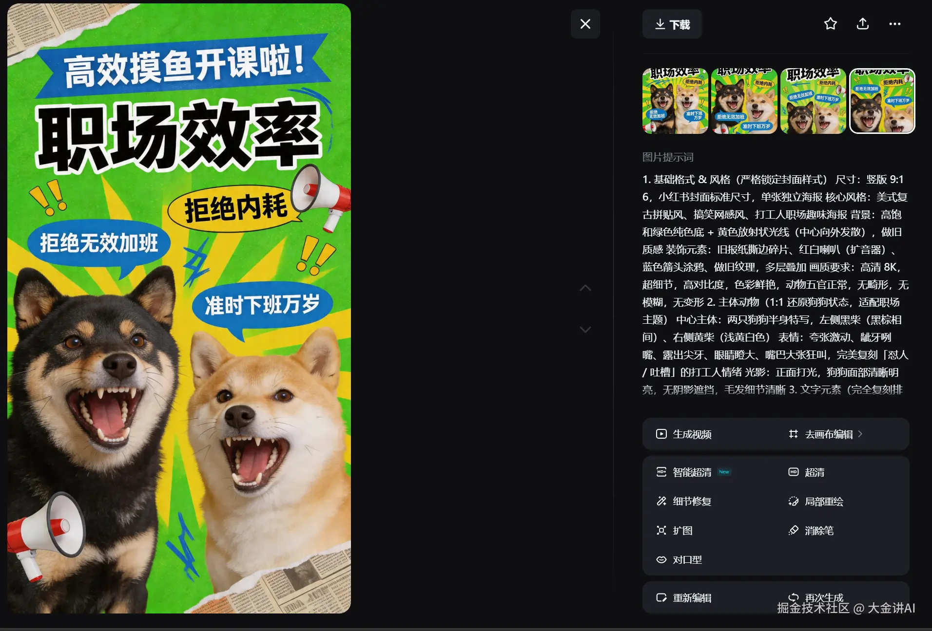 这个场景最关键的变化在于:你不再需要一张一张设计,而是可以先生成一批结构合理的图,然后选用、微调、上文字。原来你花时间在“从0到1”,现在你更多是在“从1到10”,效率差距是很明显的。