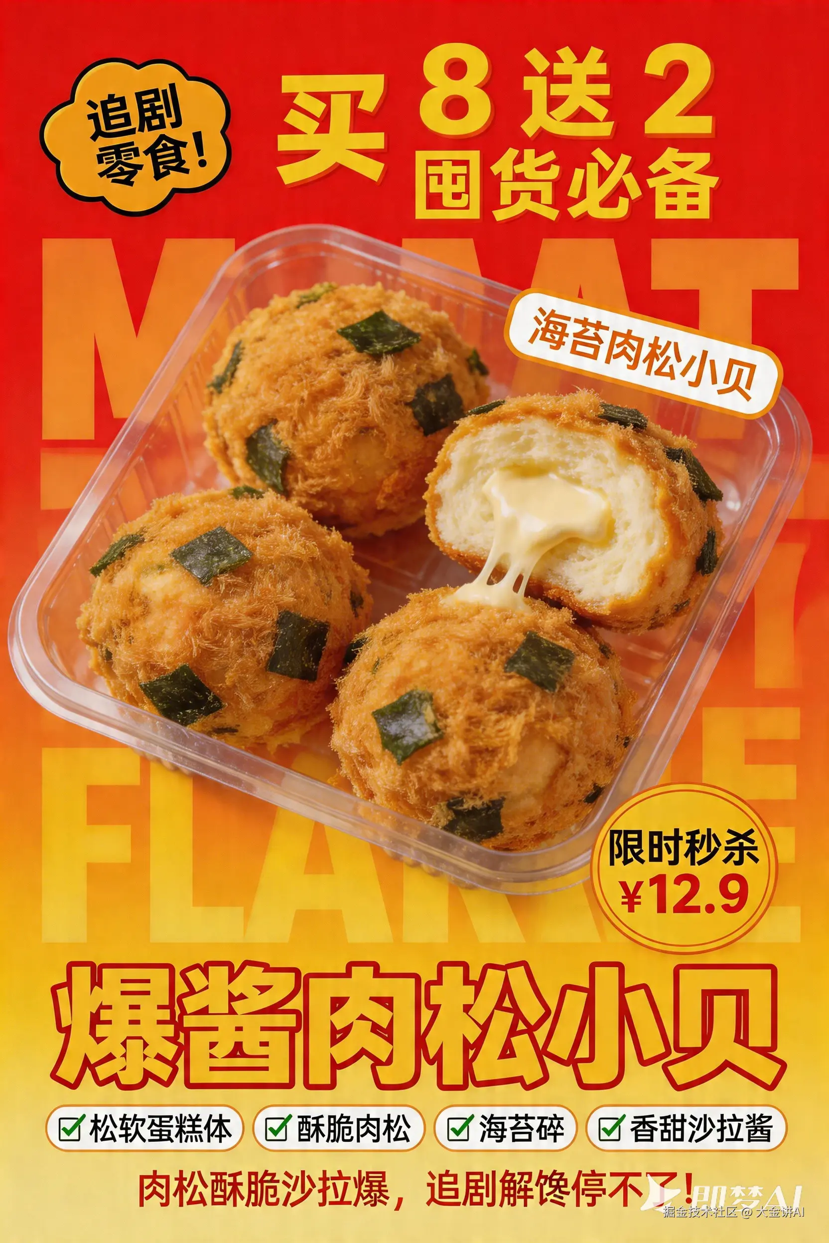 烘焙美食海苔肉松小贝促销宣传海报:以金黄 + 正红色为背景主色调,搭配高饱和橙黄(文字、装饰),结合面包本身的乳白(蛋糕体)、金黄(肉松)、深绿(海苔碎)、乳黄(沙拉酱)等色彩;采用中心聚焦式构图,将表面裹满肉松与海苔碎、掰开后沙拉酱夹心溢出的肉松小贝(4 个整齐摆放,放于透明吸塑盒)作为核心主体,背景叠加大字号模糊橙黄 “MEAT FLAKE” 字样;顶部添加 “追剧零食!” 橙黄黑边异形标签 +“买 8 送 2 囤货必备” 提示,小贝旁附 “海苔肉松小贝” 标签,右下角设置 “限时秒杀 ¥12.9” 金黄圆形标识;底部突出活泼字体的 “爆酱肉松小贝” 大标题,列出 “松软蛋糕体、酥脆肉松、海苔碎、香甜沙拉酱” 配料标签,搭配宣传语 “肉松酥脆沙拉爆,追剧解馋停不了!”;整体采用热闹解馋的促销风格,以大尺寸实物特写 + 醒目促销标识营造诱人氛围,刺激消费欲望。