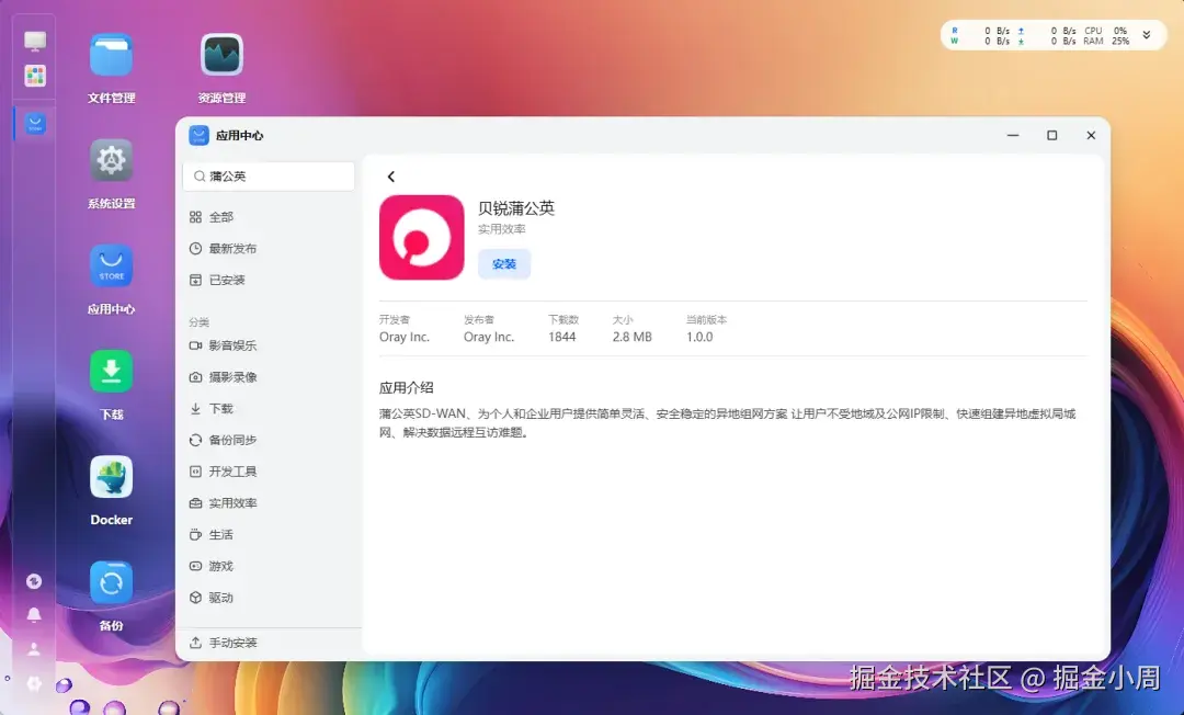 大家只需进入飞牛fnOS应用中心,搜索“蒲公英”,即可一键安装客户端,无需复杂配置,快速开启异地组网能力,实现NAS管理界面、存储文件、本地服务的远程访问。