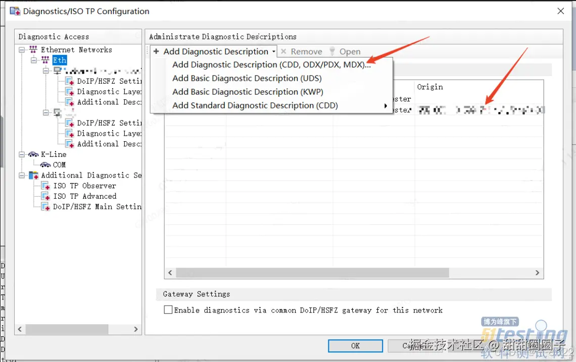 点击 网络节点(这里是Eth,CAN节点也是一样的)-> 点击 Add Diagnostic Description -> 点击 Add Diagnostic Description,然后选择自己的CDD文件即可。