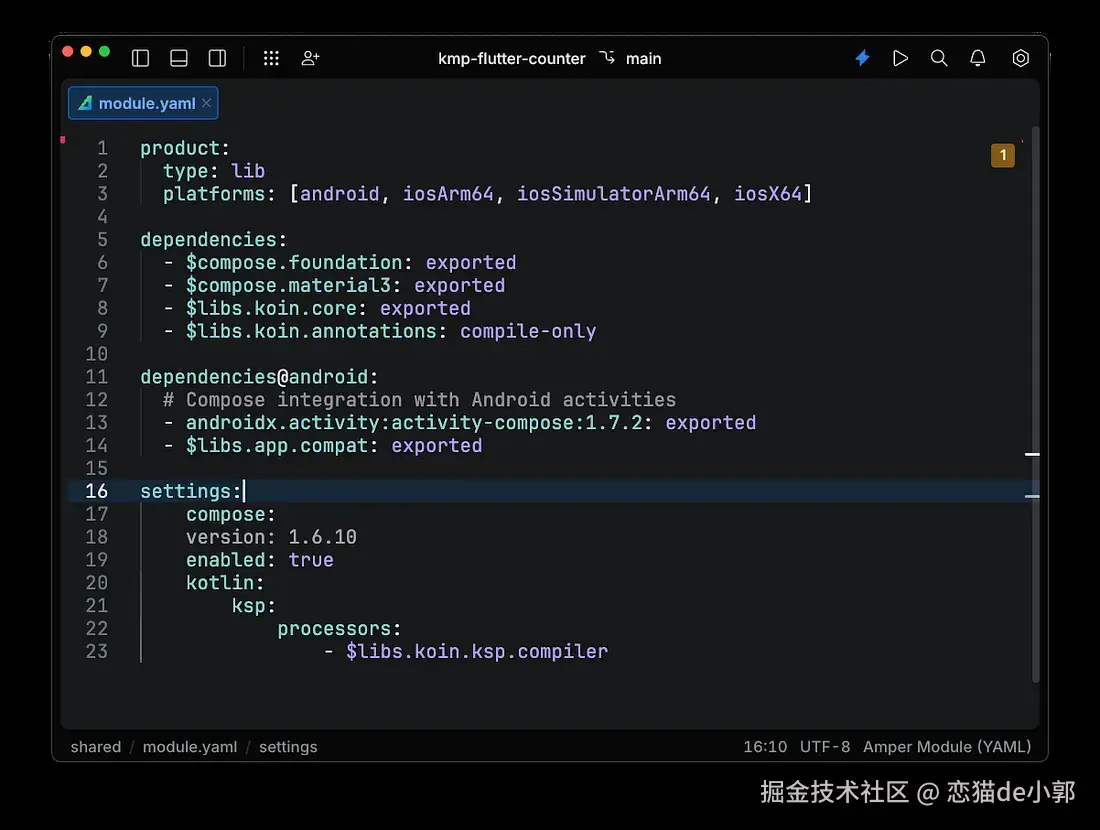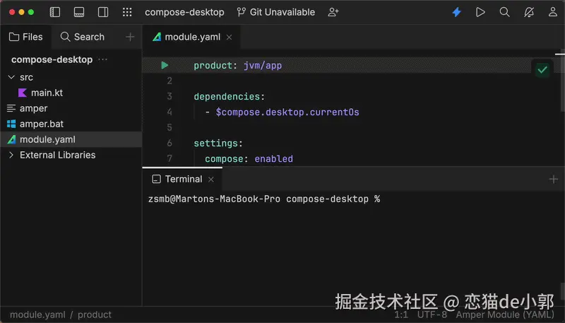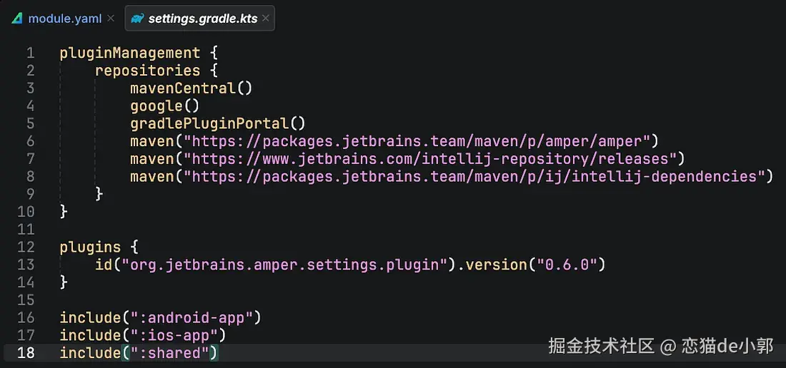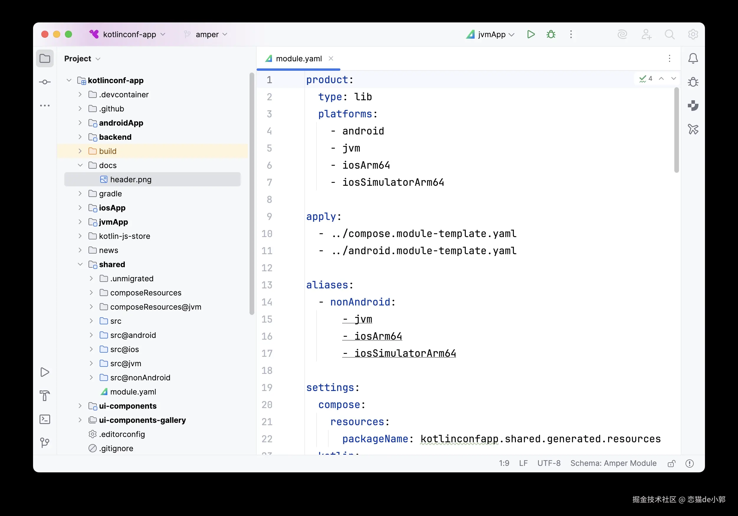 那 Amper 有什么用?简答来说,通过 Amper 可以替代现在烦人的 Gradle ,AGP 如今的体验可以说是又臭又长,特别是现在 KMP 时代,build.gradle.kts 往往越来越厚 ,而 Amper 的目的是通过 YAML 来让 IDE 更容易理解项目结构、做自动补全、特别是针对 KMP 用 YAML 来声明模块、平台、依赖和平台特定配置。