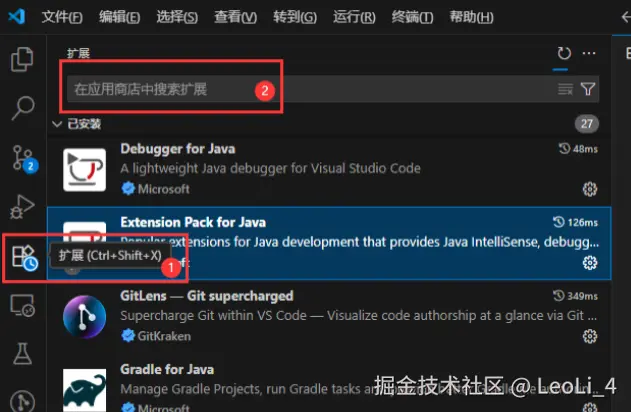 VS Code通过插件扩展Java开发能力,点击左侧的"扩展"按钮或按Ctrl+Shift+X,搜索相关插件进行安装