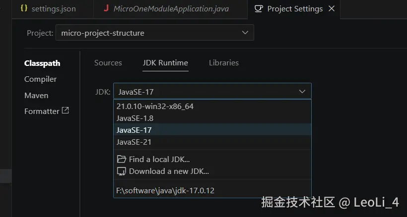 随着 Java 的发展,开发人员使用多个 JDK 版本是很常见的。您可以通过设置 java.configuration.runtimes 将它们映射到本地安装路径。该设置的格式如下:(注意替换为自己本地安装的JDK的版本和路径)