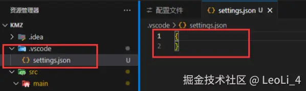 按下打开工作区设置(JSON)后,会在当前项目目录下自动创建一个.vscode 的目录,目录下会有一个 setting.json