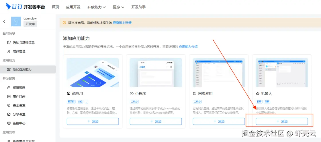 应用创建完成后,进入该应用的专属功能面板,在应用能力区域找到机器人选项,点击 + 添加,为当前企业内部应用开通机器人能力。这是实现 OpenClaw 与钉钉对接的核心前提,未开通此能力无法完成后续机器人配置。