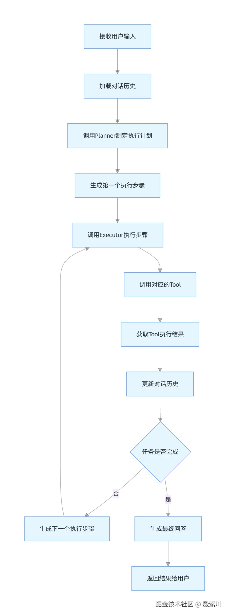 - 执行步骤:Executor按照顺序执行每个步骤,调用对应的Tool