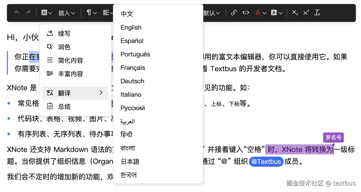 最后 XNote 也更新了,添加了段落拖拽排序, AI 续写、翻译、优化内容等功能。欢迎大家试用,演示地址:textbus.io/playground。