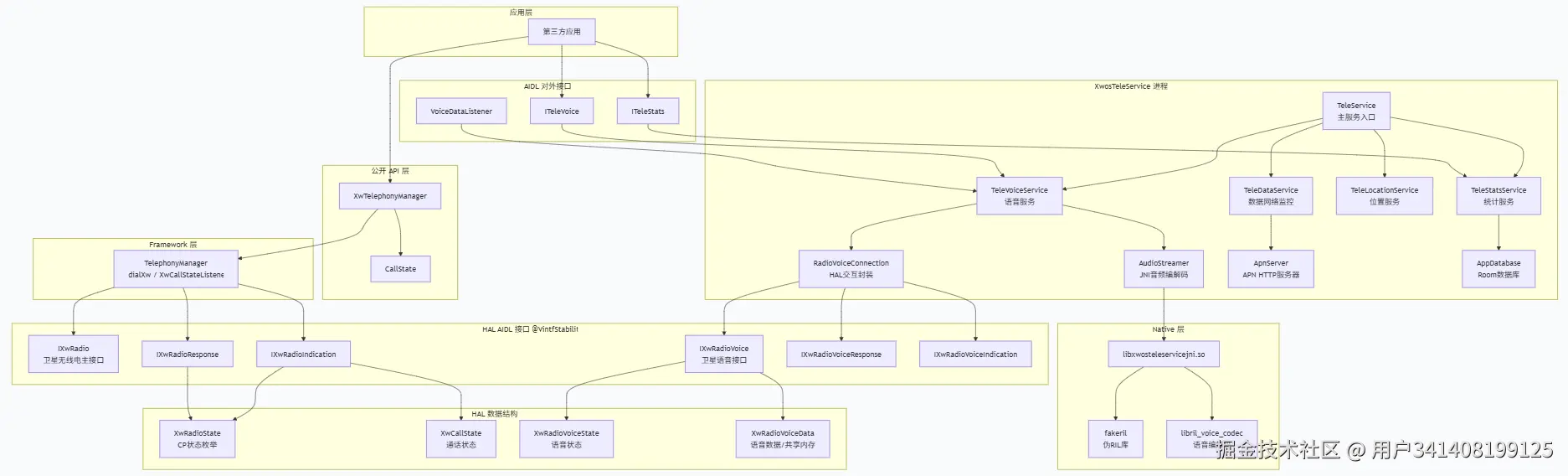 satellite/子包,卫星通信功能以 XWOS(星网卫星 操作系统 ) 定制扩展的形式实现,代码集中在xwos子包和XWRadioConstants接口中,并通过TelephonyManager和ITelephony.aidl暴露接口。