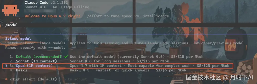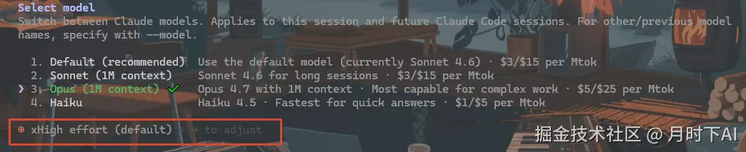 如果你在用 Claude Code(VS Code 或 JetBrains 插件),更新到最新版本后,Opus 4.7 会自动成为默认模型,推理级别默认 xhigh。