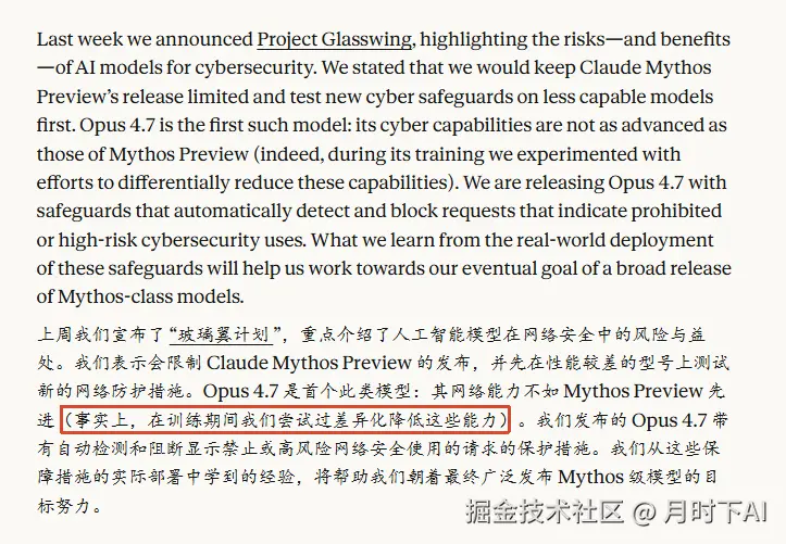 这个有点意思。Anthropic 在训练 Opus 4.7 的时候,故意削弱了它的攻击性网络安全能力,同时加入了自动检测机制,会自动阻止高风险的网络安全请求。