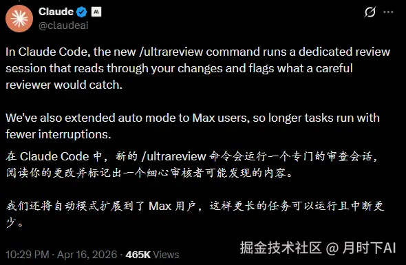 /ultrareview 是 Claude Code 新增的命令。你在代码合并前运行它,它会在云端启动一批审查 Agent 并行扫描你的代码,找 bug。每个发现都会被独立复现和验证,不是随便报一个就算。