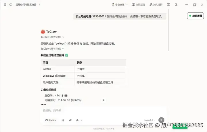 这就是微信端接入的价值。微信是中国用户日均使用频次最高的App,ToClaw通过官方ClawBot插件扫码直连之后,AI入口直接放到了你最常用的沟通工具里。无论是出差、开会还是通勤路上,掏出手机说句话,电脑端的ToClaw就开始干活。工作流不中断,场景切换零摩擦。