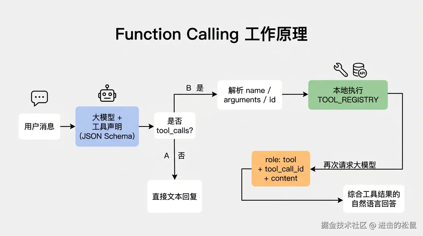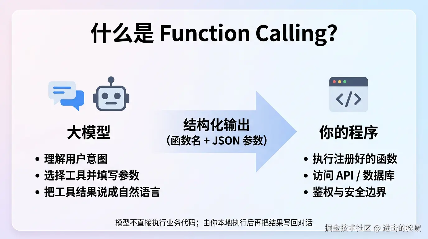 关键点:模型不会自己执行代码,它只会产出“调用意图”和参数。
