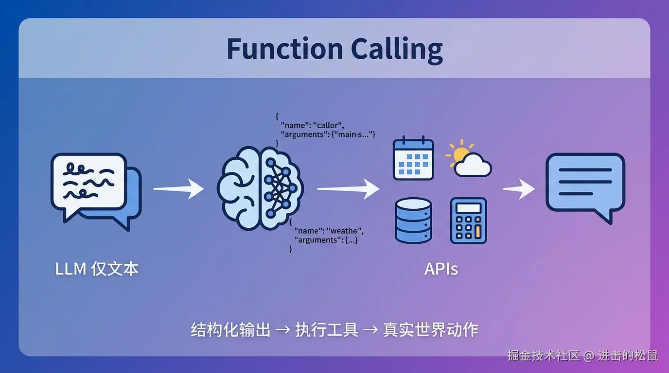 Function Calling 的本质,是把「会说话的模型」与「能做事的系统」用一条清晰契约连接起来: