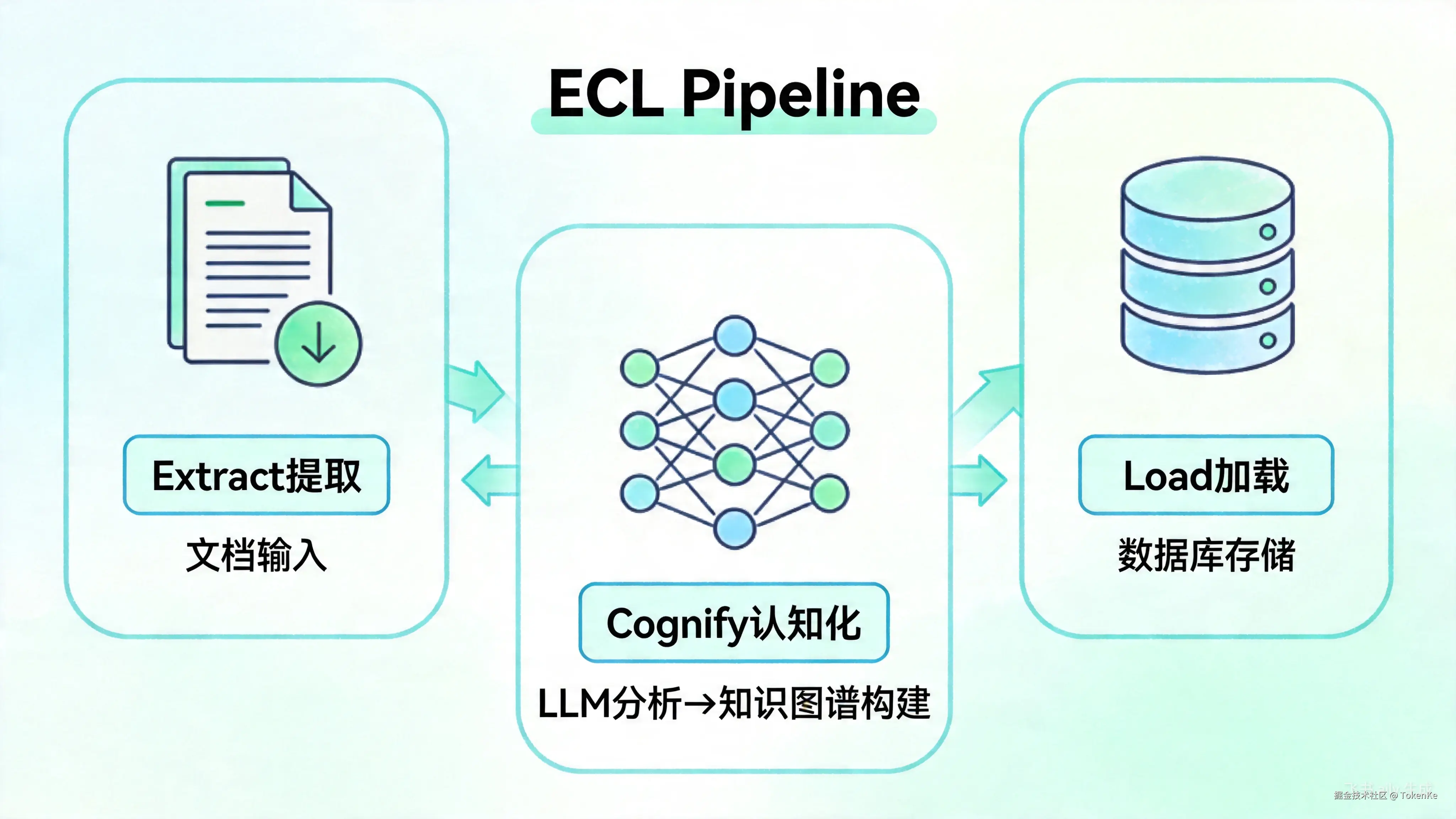 Cognee的ECL Pipeline(Extract, Cognify, Load)实现了从原始文档到结构化知识的全自动转换: