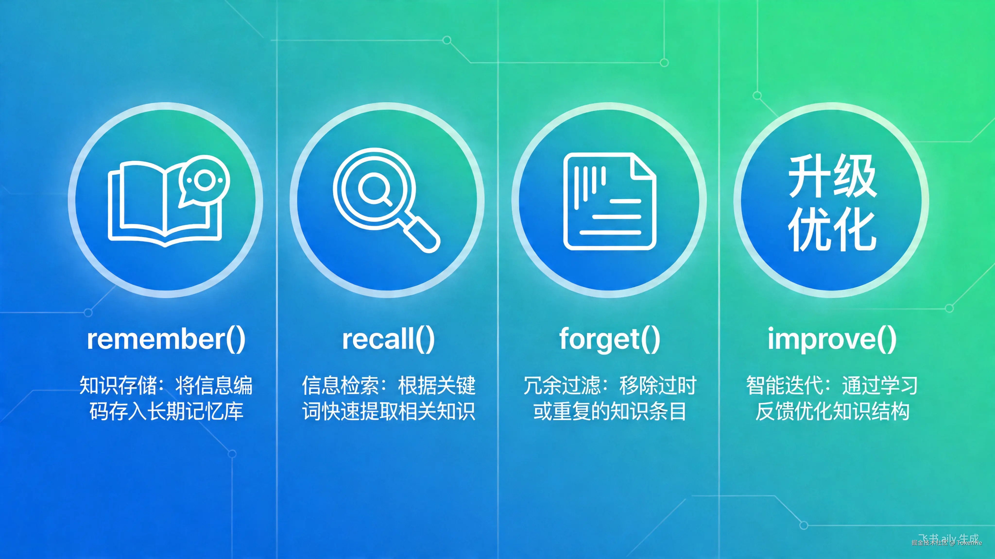 - forget():精确删除特定数据集或知识片段,控制记忆边界