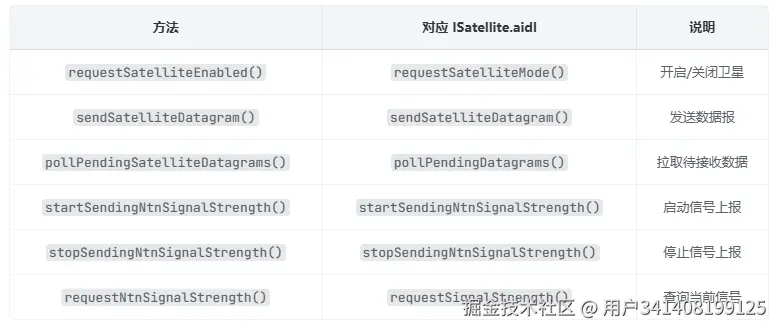 职责 :Framework 与厂商 SatelliteService 之间的 Binder IPC 客户端代理。是 Android 卫星通信架构中的 "翻译官" ,它将 Framework 层的调用转换为 Binder IPC 请求,并将 Modem 的事件回调分发给上层感兴趣的组件。SatelliteModemInterface 通过 ISatellite.aidl 接口与厂商服务通信。