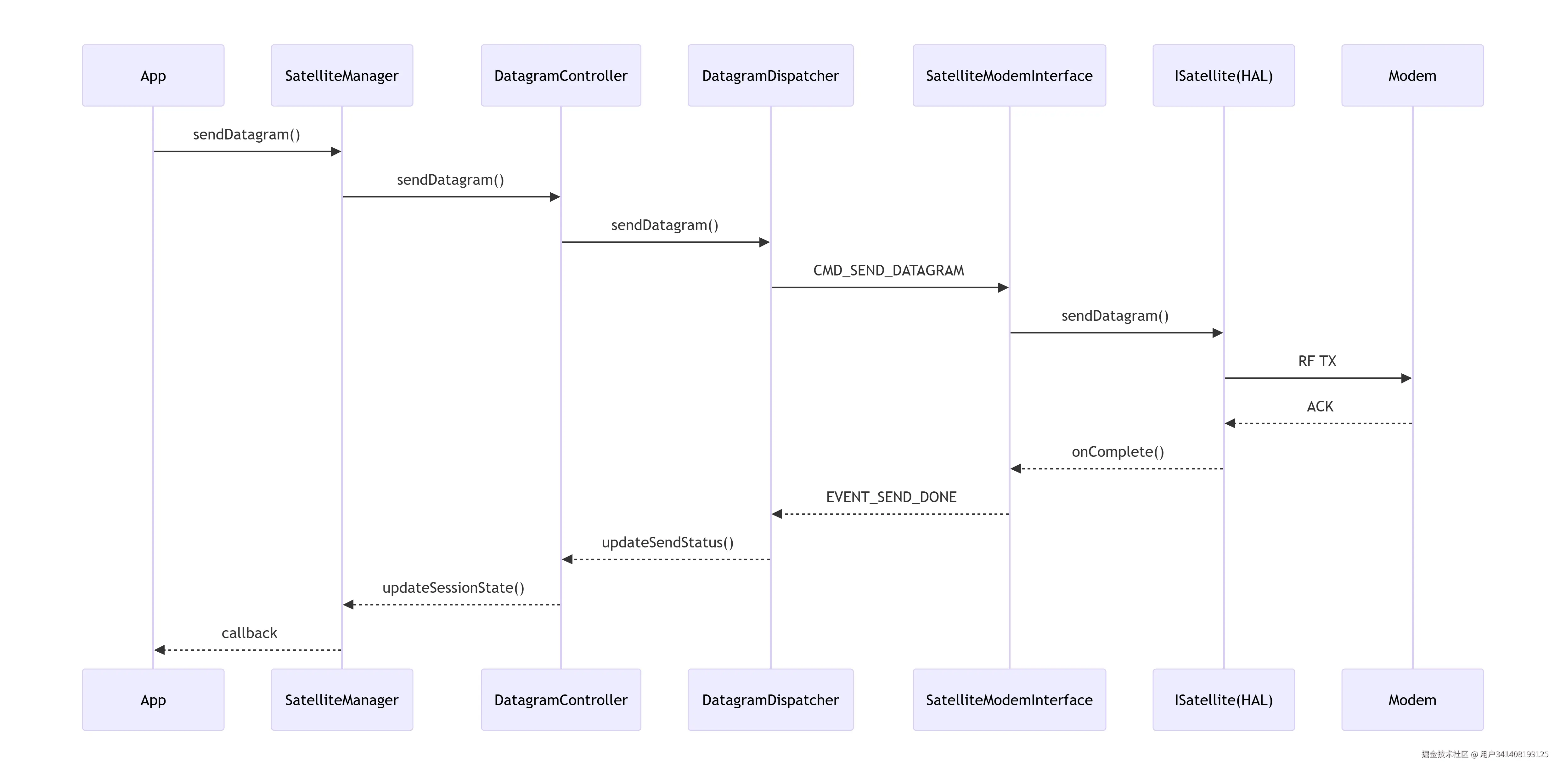 Modem 发送完成 → HAL 回调 → ISatelliteListener (Vendor Listener) → SatelliteModemInterface.mSatelliteDatagramsReceivedRegistrants → DatagramDispatcher.handleMessage(EVENT_SEND_SATELLITE_DATAGRAM_DONE) → 更新 mPendingEmergencyDatagramsMap / mPendingNonEmergencyDatagramsMap → DatagramController.updateSendStatus() → SatelliteSessionController.onDatagramTransferStateChanged() → PointingAppController.updateSendDatagramTransferState() → callback.accept(error) // 回调应用层
