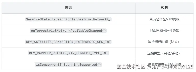 卫星网络接入:packages/modules/Connectivity 中的 SatelliteAccessController 负责卫星网络的角色管理和偏好设置。该模块会根据网络类型(蜂窝 vs 卫星)进行评分和选择,判断何时启用卫星链路。