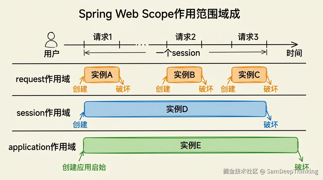 singleton和prototype覆盖了「是否共享实例」这个维度的两个极端:要么全局一份,要么每次新建。Web应用的需求在两者之间:同一个请求内的多个组件需要共享某些数据,但不同请求之间这些数据必须隔离;同一个用户的多次请求之间需要保持会话状态,但不同用户之间必须隔离。回到前面那三个问题:共享范围多大?生命周期跟随谁?request、session、application三种作用域分别给出了不同粒度的回答。
