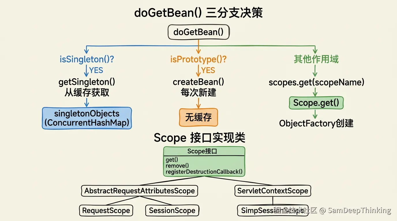 容器在doGetBean()中处理自定义Scope的逻辑也在这个方法里。核心流程是:从scopes这个LinkedHashMap<String, Scope>里按scopeName查找对应的Scope实现,调用scope.get()获取bean。Scope内部已有该bean的实例就直接返回,没有就用传入的ObjectFactory创建。如果scopeName没有对应的Scope注册,直接抛IllegalStateException。