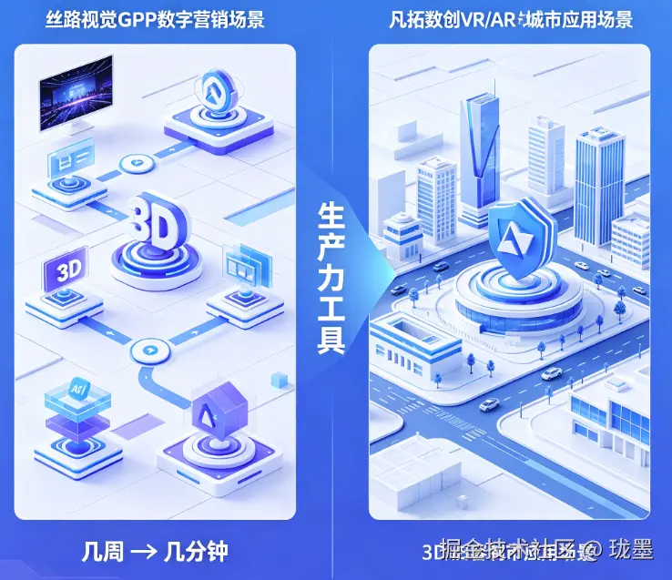 - 丝路视觉:视觉数字领域的龙头,专注CG视觉数字营销、展览展示。以前做一个3D广告片得花几周,现在AI几分钟就能生成。