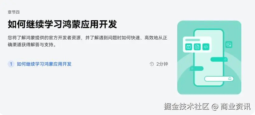 此外,零基础开发者不用担心学完就断档,第四章“如何继续学习鸿蒙应用开发”明确告诉你后续学习方向、资源入口与问题解决渠道,不用迷茫下一步该学什么、去哪学,鸿蒙开发者官网已规划好完整路径。此外,除了这套快速入门教程,鸿蒙官方还准备了HarmonyOS第一课、开发指南、Codelabs、知识地图、开发者社区等全套免费资源,从入门到进阶、从开发到上架,一站式配齐。