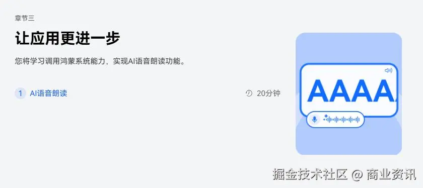 更惊喜的是,第三章 “让应用更进一步” 直接带你用上鸿蒙特色能力。不用复杂调用,就能实现AI文本转语音功能,让弹幕不仅能滚动展示,还能实时朗读,瞬间让简易案例升级成更完整、更智能的实用工具。简单几步就做出科技感效果,极大提升新手的开发信心。同时,教程还将教你定义资源销毁的方法,以便通过页面关闭销毁相关资源,节约运行开销。