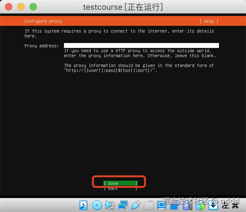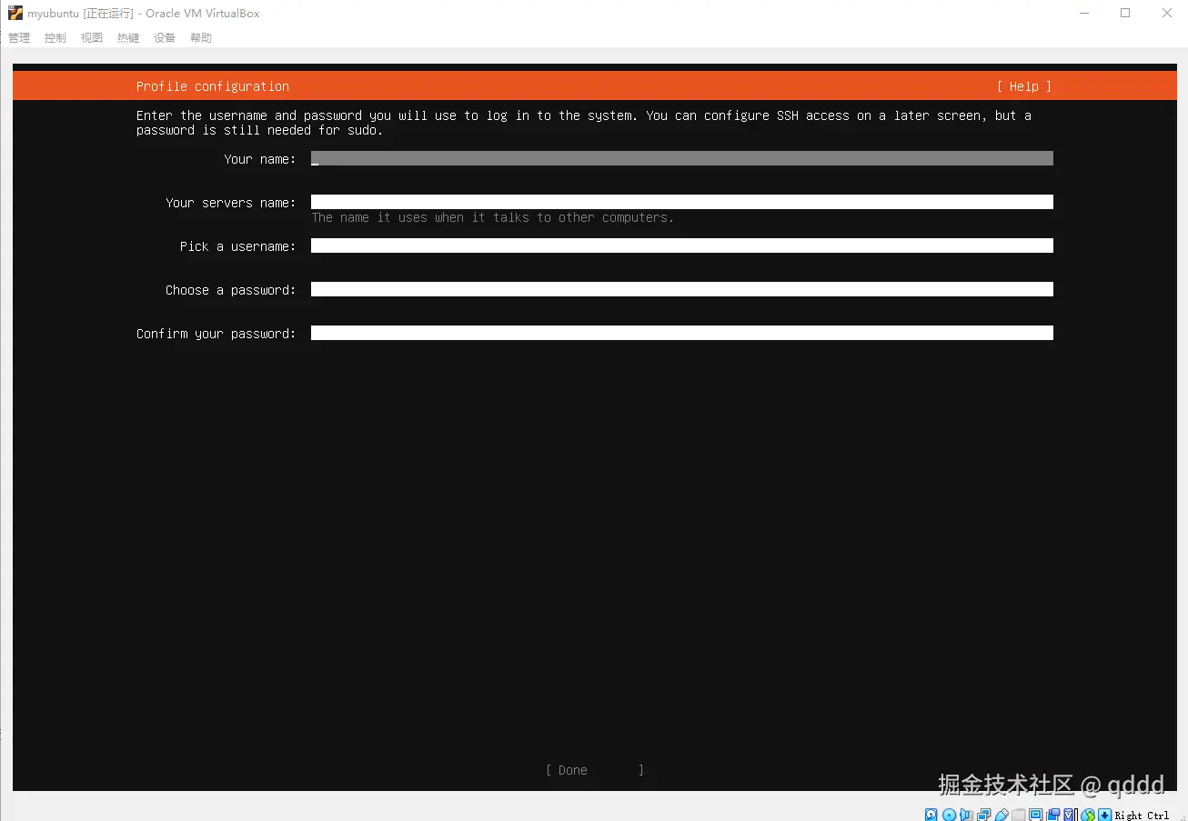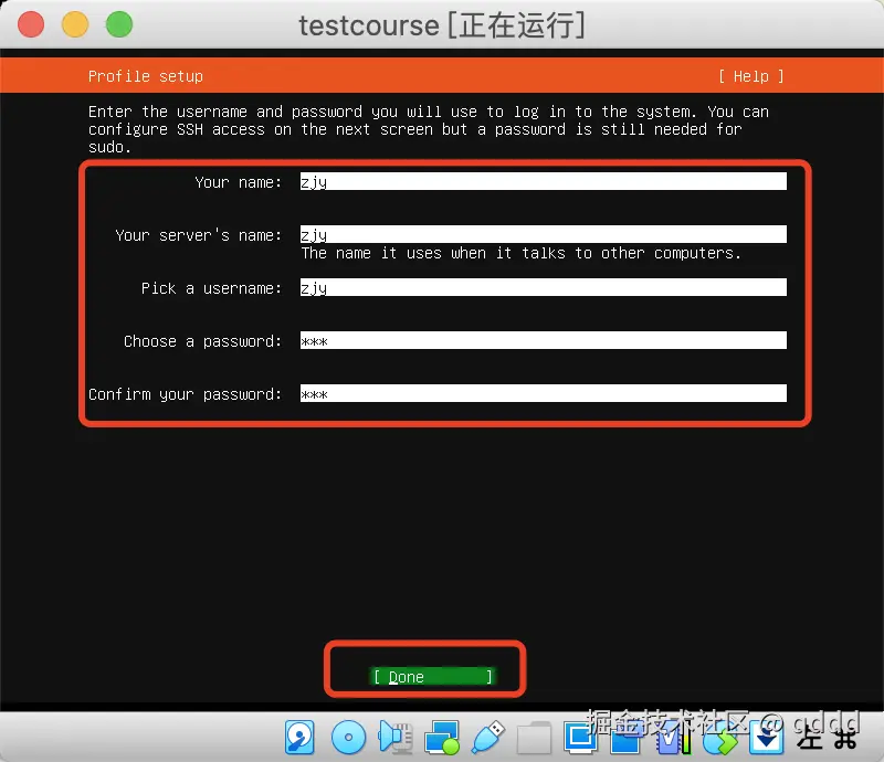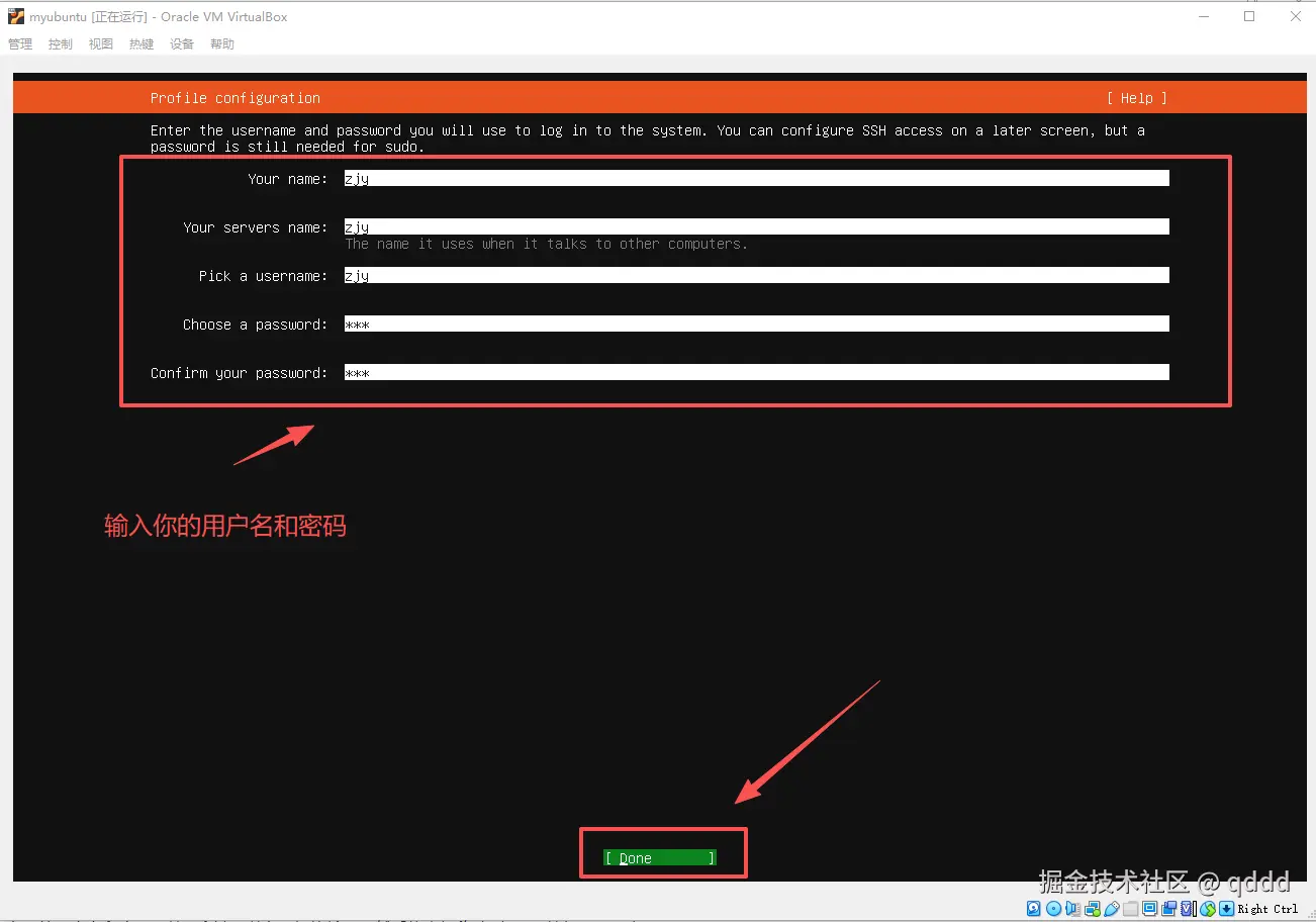 设置好你自己的用户名和密码,按Tab键可以向下切换输入,然后将光标移动到Done按钮上,回车即可