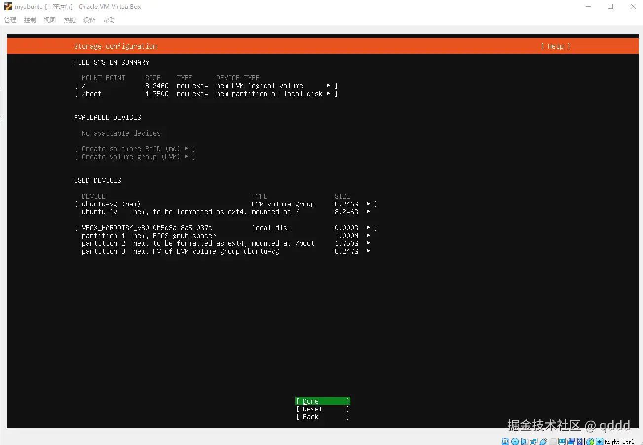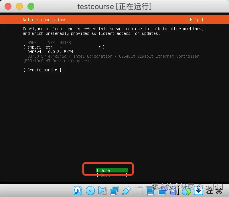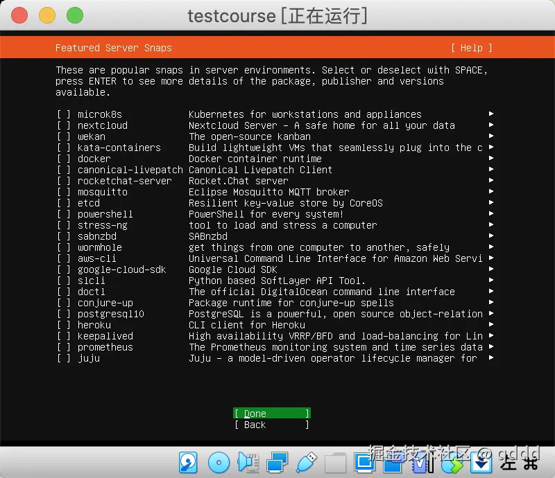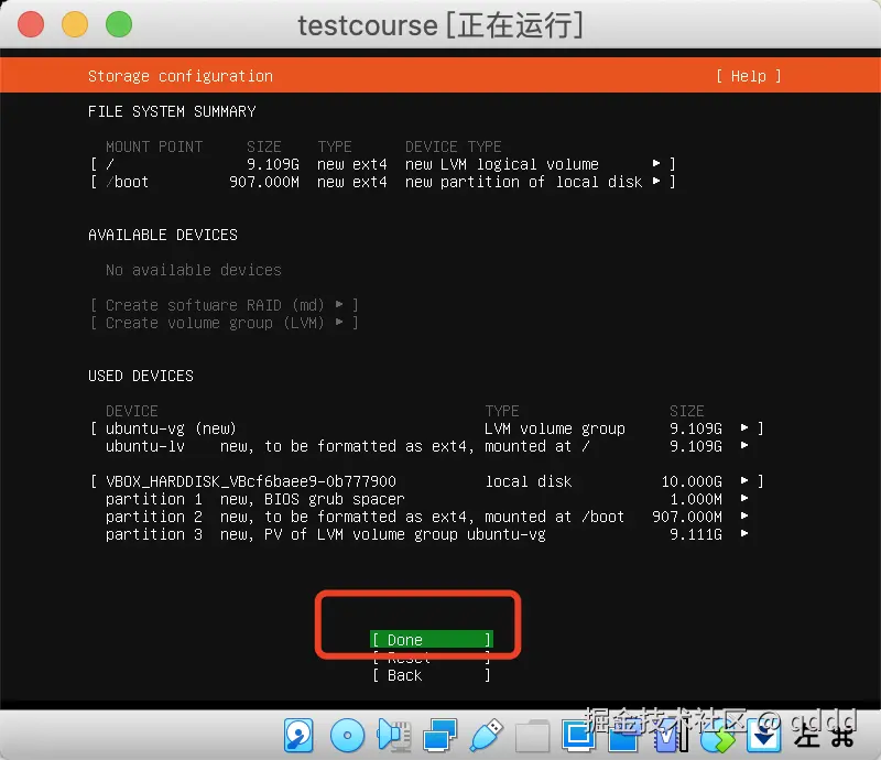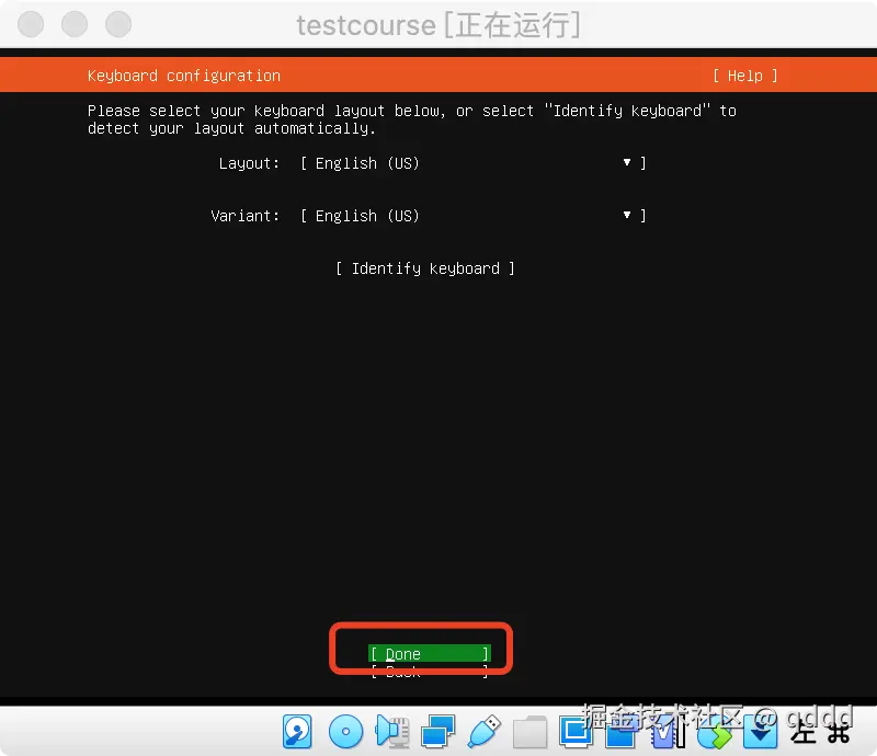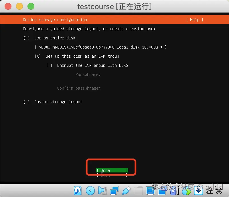 我们都不用管,直接按键盘**”下“按钮,把光标移动到Done**上,然后回车即可,后续需要的东西我们会自己安装。